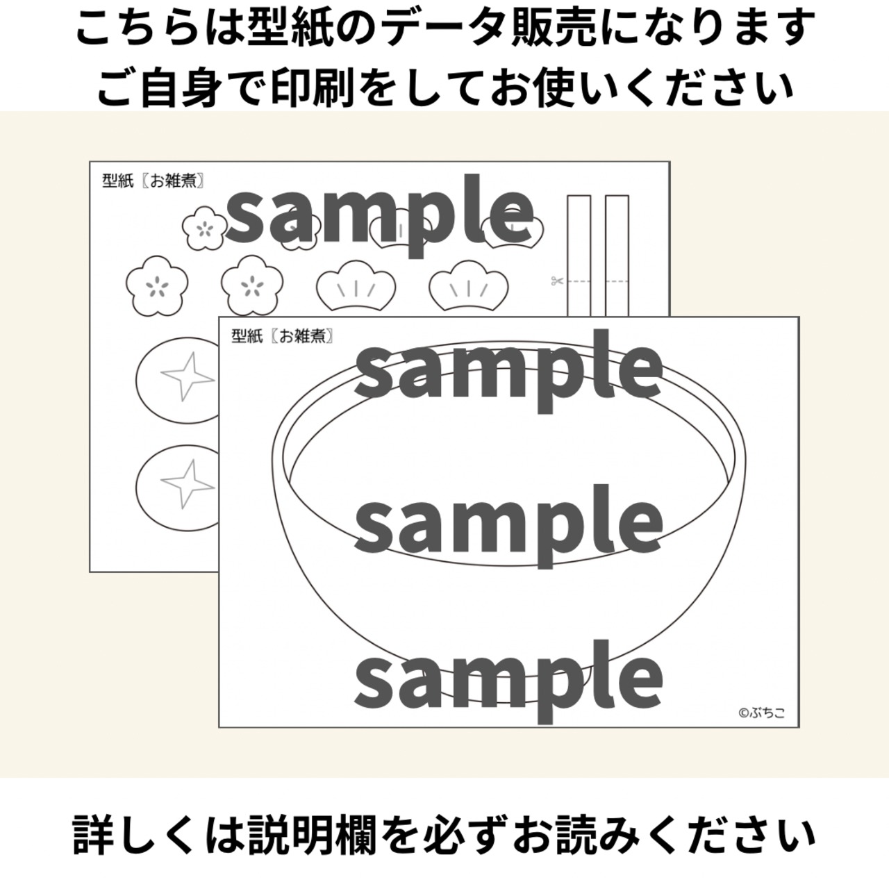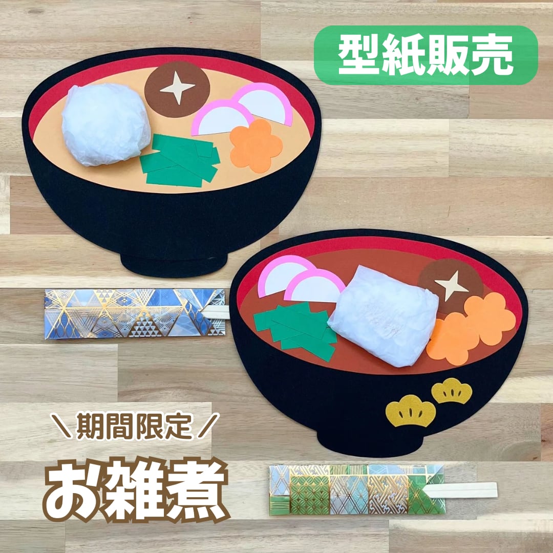 ▶内容:お椀、しいたけ、にんじん、かまぼこ、小松菜、松、梅の花の型紙×2